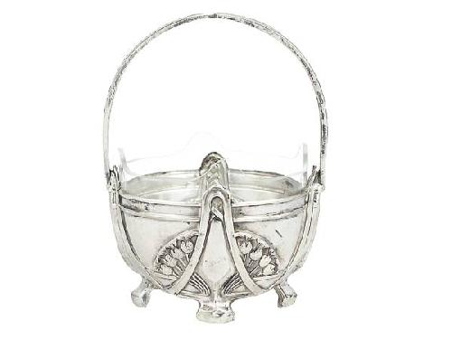Silver, 94 g. Round, bellied form with lily-of-the-valley decoration raised on four supports. Restored handle, the blown glass lining is later replacement. Marked: German, circa 1900, import mark from Prague. Size: 15 cm