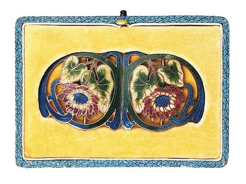Brass, coloured, translucid enamel, painted flowers. Original box. Gablonz, circa 1900 Length: 10 cm