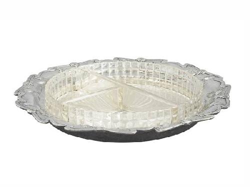 Silver, 643 g. Round bowl, floral decoration on the rim. Blown and cut three part glass lining (minor chips). Marked: Vienna, circa 1900, Franz Rumwolf. Neuwirth: II/167. Diameter: 34 cm