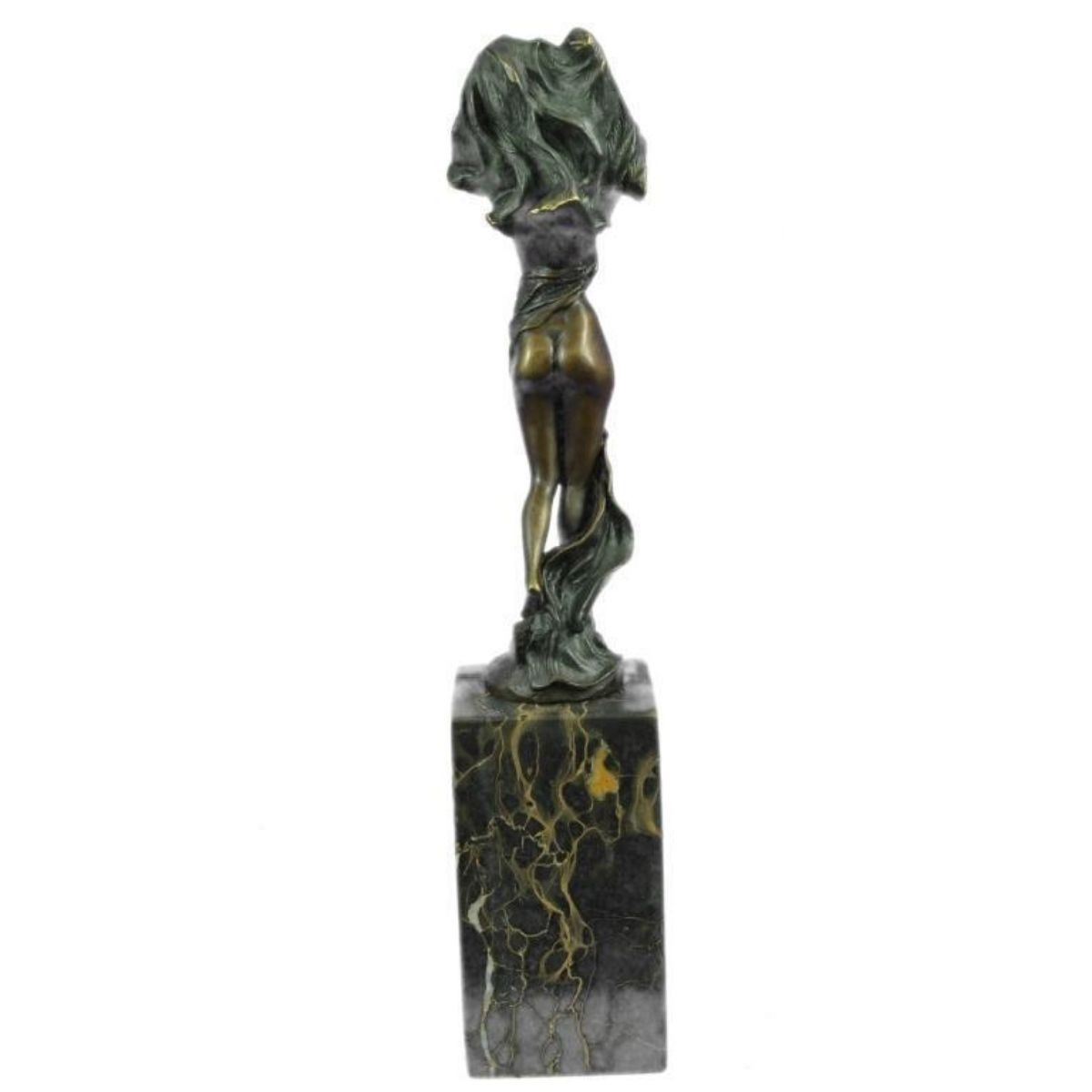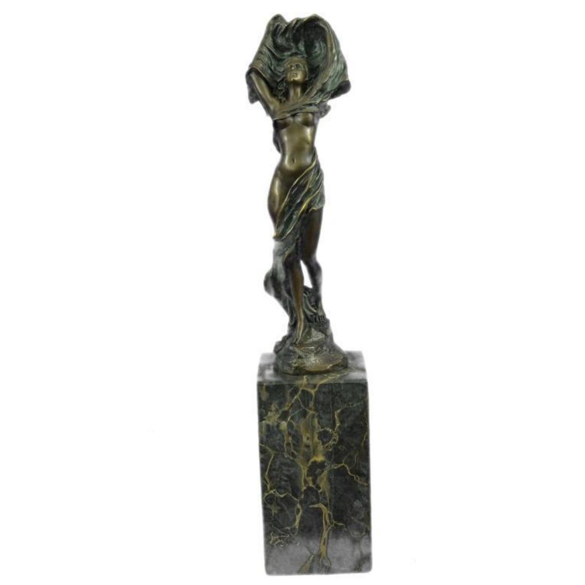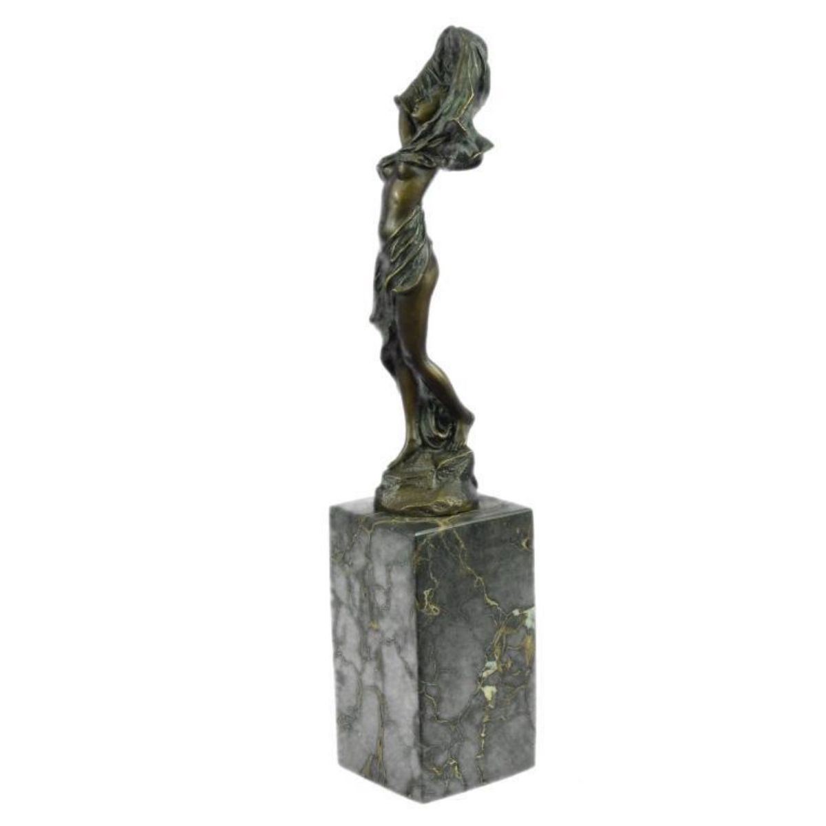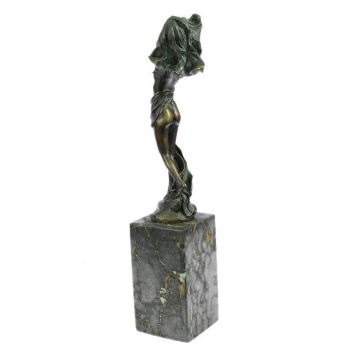 Art Nouveau-style statue of a nude girl, partially covered with a drape. Lost wax casting method bronze, with patina, mounted on a tall marble block base. 14" H X 3" W. 7lbs.