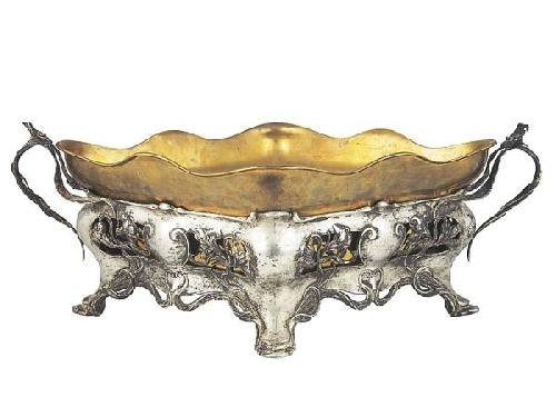 Silver, 760 g, replaced brass lining. Lozenge shape dish raised on four feet, pierced sides with floral decoration, cast handles. Marked: German, circa 1900 Size: 46 x 29 x 17 cm