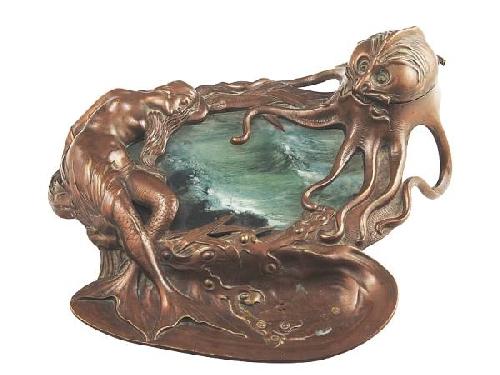 Cast bronze with patina, painted glass plate in the middle: surfy sea. The inkpot with hinged cover is depicting an octopus, at the border of the dish there is a marinade resting among water-plants. German, circa 1900 Length: 25 cm