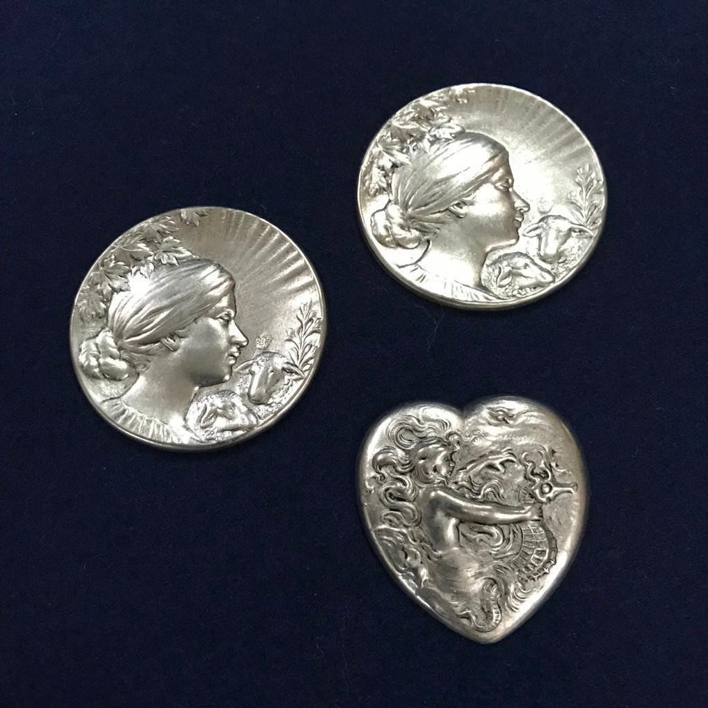 New, Art Nouveau style, metal stampings, decorations, jewelry, craft & art findings. Heart & medallion shapes. 1 1/2" - 1 3/4"D size.Â