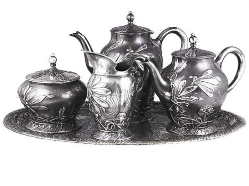 Silver-plated pewter. Teapot, milk jug and sugar box on oval tray. Worn silver-plate. Marked: German, Gerhardi & Co., circa 1900.