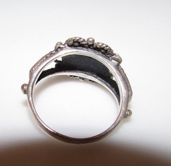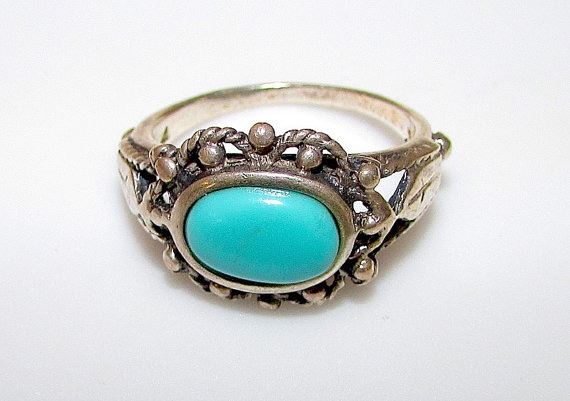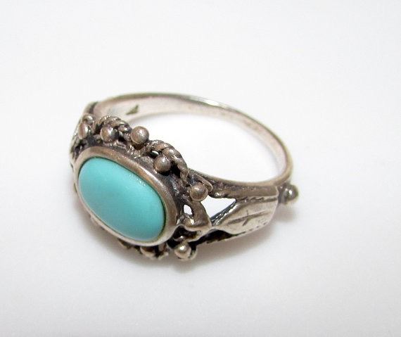 For your consideration is this fabulous vintage Art Nouveau sterling silver and turquoise cocktail ring in size 6. This gorgeous statement ring features a romantic design in sterling silver accented with a light blue turquoise cabochon. The ring remains in wonderful vintage condition. Excellent craftsmanship, the ring is marked 925, and has been tested for silver content. Superb addition to any jewelry collection!