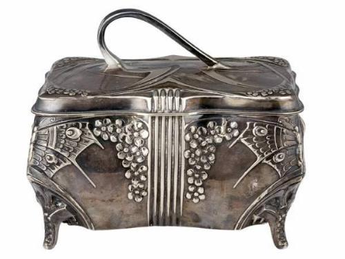 Silver-plated nickel-silver, gilt interior. With flowers and butterflies on the surface. Marked: Szandrik, circa 1900 Size: 13 x 9 x 8 cm