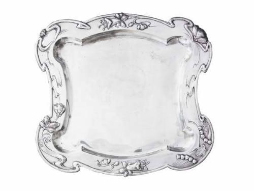 Silver, 1099 g. Floral decoration on the rim. Marked: Austrian, circa 1900, Johann Matthias Machacek. Neuwirth: II/41. Size: 42 x 36 cm