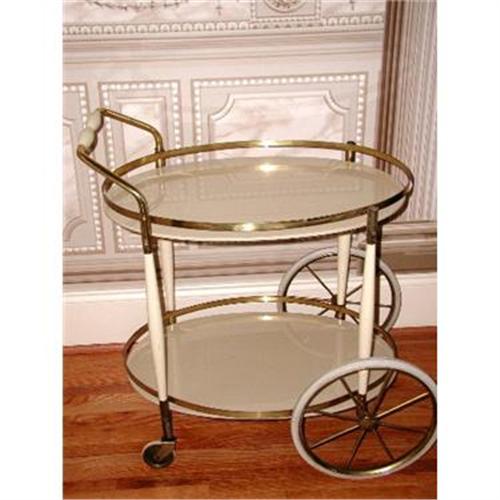 Art Nouveau European tea cart has a delicate look with brass railings and fittings combined with cream. The handle and legs are wooden. The two oval shelves are easy care ceramic tile in excellent condition. All four wheels are rubber which matches the cream paint,lined with brass rims and spokes which makes for easy rolling if desiring to move from a kitchen or dining area to porch for entertaining. Excellent condition overall,very slight discoloration in spots to the aged brass on tire rims. Measures 30H X 32L X 18.5W.