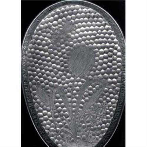 An Egg Shaped Oval Tray. 12.1/2" long X 8" at the top and 6.1/2" at the bottom of the oval. Marked "Meridan Silver Plate Co. Quadruple Plate" Hammered honeycomb pattern on the front with a dragonfly and a Tulip, other small flowers and leaves.The rim is decorated alternately with an owl,a heron,a squirrel a wasp, a cricket and a locust. This pattern is repeated around the edge. Slight wear to the surface, nothing serious. Circa 1910