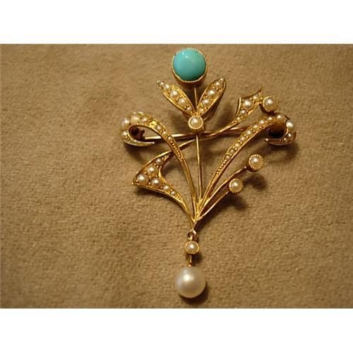 <tr><td>Title:Art Nouveau Turquoise Pearl Yellow Gold Brooch</td></tr>