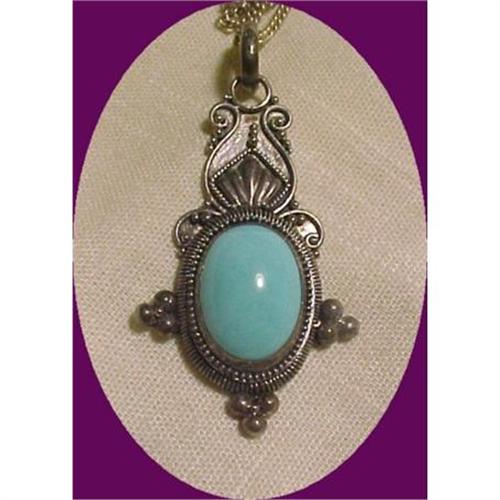 Art Nouveau Turquoise & Sterling Pendant Necklace. It is very long and ornate 2 3/4 "long sterling pendant with a 3/4" long oval turquoise cabochon. It is marked on the back 925. It comes on a 16" sterling chain. The entire drop length of the pendant is 10" from the clasp to the bottom point of the pendent. Other then some old petina this piece is in excellent.
