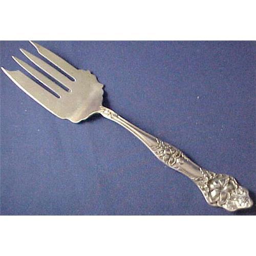 This large, gorgeous 7 1/2" long sterling silver meat serving fork is in the most wonderful Art Nouveau violet pattern. It is called Landers No. 2 by Baker Manchester. It features intricate floral details on both the front and the back of the handle. This fork is in extremely good, unmonogrammed condition.