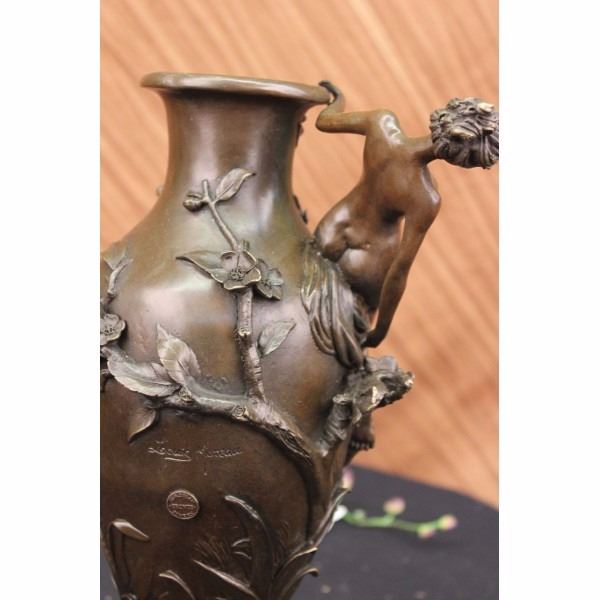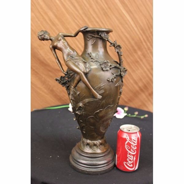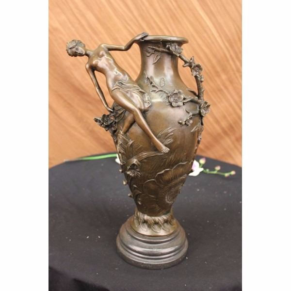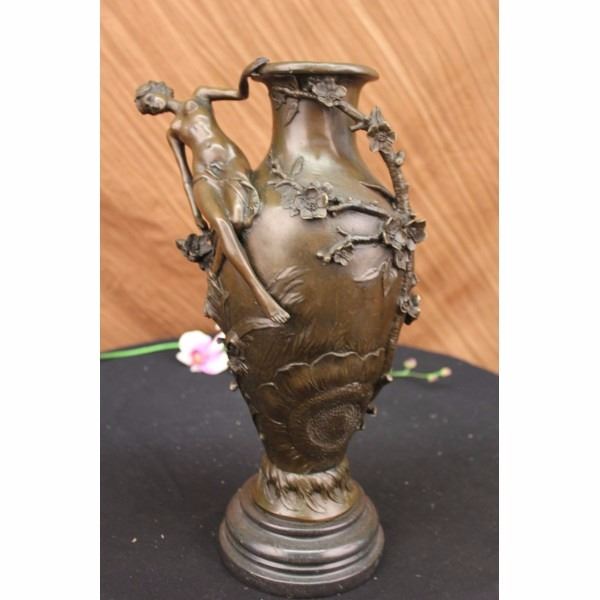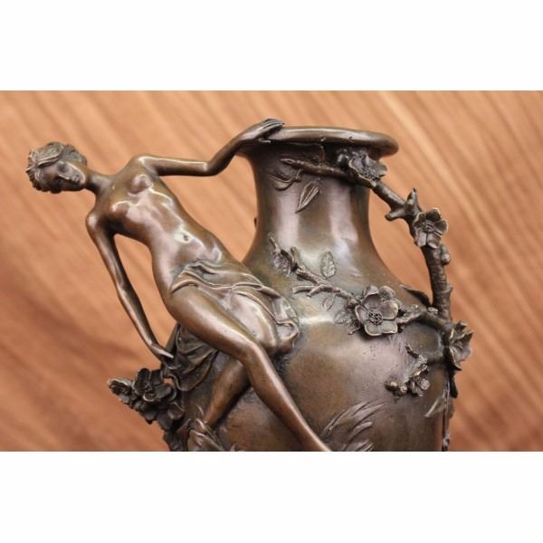 An exquisite vase that would be the center of attention in any room. A nude woman dangles off the edge, hovering over a field of flowers. she leans back, holding onto the edge. Vines and blossoming flowers spiral around the round vase. The beauty in the sculpture is in the detailing of the flowers that seem to pop out. This unique piece can act as a flower pot or just an eye-catching addition to your abode. This brown patina sculpture was cast using the lost wax method and mounted on a marble base. Bronze dimensions with marble base: Height 16 X Width 10 inches. Weight: 15 lbs.