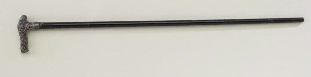 Art Nouveau cane with cast grip which is silver plated showing portraits of a lady surrounded by florals and a large insect in French style. The cane measures 33" overall, the cast portion measures approx 2-1/2" by4-1/2". The shaft is blackened hardwood in an ebonized finish. The cast portion shows a dark uncleaned silver patina. Est.; $300.-$600.