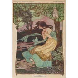 Art Nouveau print, woman in the wind, marked, matted, framed, 8” x 11