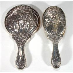 Art Nouveau silver backed hand mirror and matching brush, embossed with a maiden in a flowing dress surrounded by stylised flowers, Chester 1908