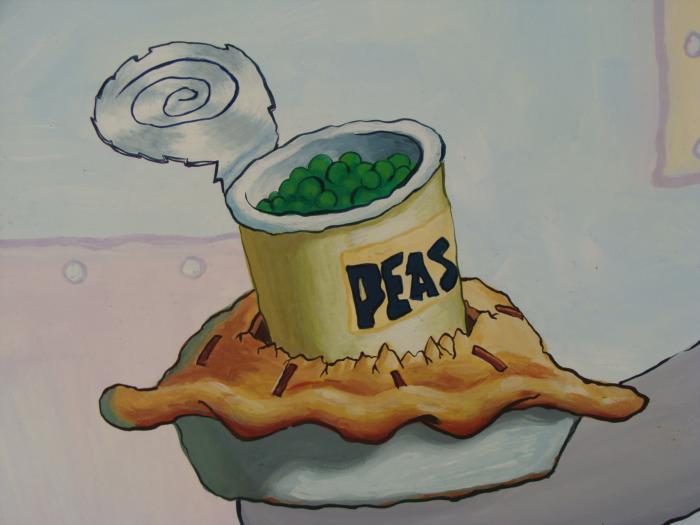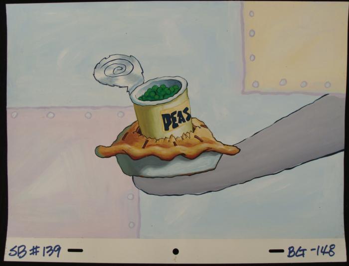 This original hand-painted background from the Nickelodeon TV show SpongeBob Squarepants. The story takes place under the deep blue sea in Bikini Bottom, where SpongeBob resides. SpongeBob, who is a yellow, porous sponge, is your typical happy-go-lucky character, as he is always cheerful and enjoys making people laugh. Patrick Star, SpongeBob's neighbor who is a starfish, is your average children's show idiot, as he boasts knowing nothing and is often getting himself into ridiculous situations. Between the homes of these two lies the home of the miserable Squidward, a squid, who is known for being grouchy and playing tricks on SpongeBob and Patrick. Both SpongeBob and Squidward work at the Krusty Krab, a fast food business run by the greedy money-loving Mr. Krabs, a crab, the arch rival of the evil, possibly misunderstood, Plankton. Another neighbor, Sandy Cheeks, an athletic squirrel who normally wears an astronaut's space suit, was introduced in "Tea at the Treedome." She spends most of her time inventing and experimenting. Can of peas pot pie anyone?Original Production Background Overall Size of Background: 10 1/2" x 13 3/4" Very good condition; it has been stored rolledOriginal Production Backgrounds are used in the making of the final version of animated productions. The background establishes the location and the overall good mood of the scenee. Typically, a background layout artist creates a drawing to establish the content of the scene, placement of characters, perspective and camera angle. Based on this drawing, the background artist creates a preliminary painting to confirm all of the scenes details, then the final production background which is used in the filming of the scene. When these backgrounds are individually photographed behind the progression of production cels, and projected at a rapid succession, the images in the foreground appear to move, creating an animated scene. The background is ready to be matted and framed. It is a colored background with the animator's notations at the bottom.