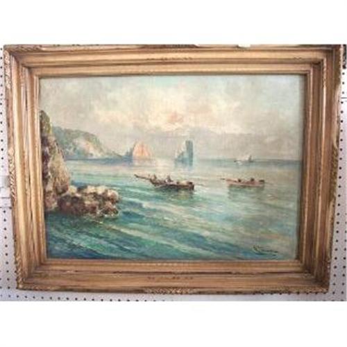 Framed oil painting, Mediterranean coast line seascape scene w/bluffs, cliffs, men in boats (long boats), sail boat in beautifully worked soft colors.