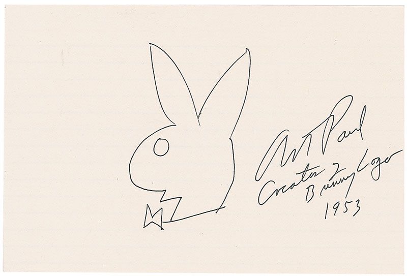 Original signed ink sketch of the Playboy bunny on an off-white 6 x 4 card, signed “Art Paul, Creator of Bunny logo 1953.” In fine condition.