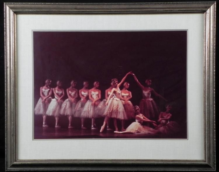 This photograph captures, on the stage, the grace and beauty of a live ballet. * * * Medium: Photographic print Image size: 19 x 13 1/2 inches Framing: Double matted in natural silk and silver, in antiqued silver painted wood frame * Frame size: 26 1/2 x 21 1/2 inches Condition: Excellent