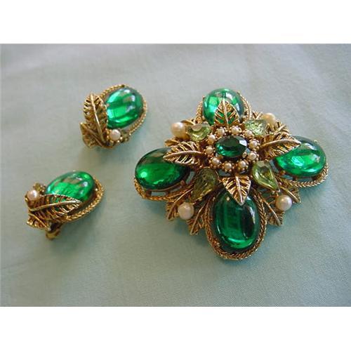 2 inch by 2 inch ** Beautiful Goldtone Pin with Flower Center ** Four Large Green Glass Cabechons Prong Set Accented with Light Green Rhinestones and Faux Pearls ** Beautiful Clip On Earrings to Match ** Excellent Condition