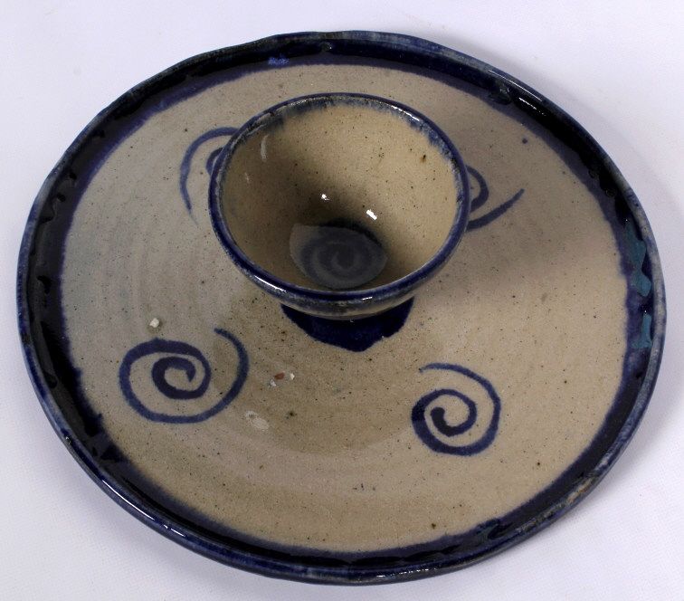 This is a hand made work of art stoneware piece with a cobalt blue salt glaze and is signed K. R. Fellows. This has a great primitive or Folk Art look with a slight lean to the bowl and has no chips or cracks. The dimensions are 2.75" tall, 9.5" in diameter, and a 3.5" in diameter cup.
