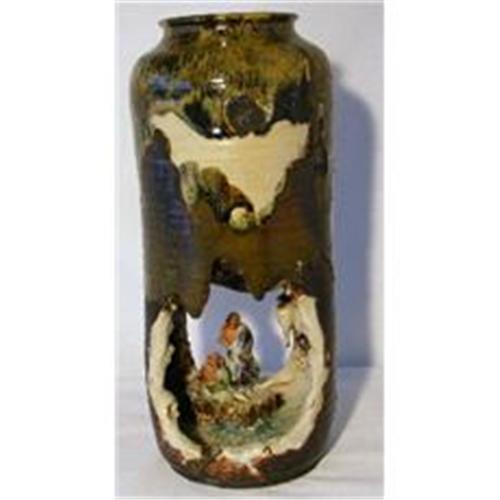 More pics. available. This is from a private estate. A fabulous Tall vase, 7" deep from the top under which is an open Grotto with two figures wrapped in skins,(Lohan, Buddhist monks?) one sitting, one standing, both gazing into a reflecting pool. The whole piece is molded from red earthenware and painted black then slip glazed with a Black, Grey and White slip that was allowed to run down the sides. A Amazing piece of art. Provenance supplied by the family.