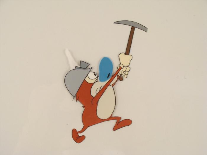 This is an original production animation cel from the Nickelodeon TV show Ren & Stimpy. The show follows two characters - Ren, a crazy Chihuahua - and - Stimpy, an incredibly stupid cat - as they think up to all kinds of hair brained schemes and get themselves into some sticky situations. The Ren and Stimpy Show debuted in August 1991 with a two-part episode, 'Stimpy's Big Day / The Big Shot' and became an instant hit. It was the third Nicktoon ever to be aired on the Network alongside Doug and Rugrats. Has Stimpy strike something big while he was mining?Original Production Art Cel Overall Size of the Cel: 10 1/2" x 12 1/2" Excellent condition This is an original hand-painted cel set-up used in the production of an episode of "The Ren & Stimpy Show." Each one-of-a-kind set-up represents a slight change in position of the characters. When individually photographed and projected in rapid succession, the images appear to move.