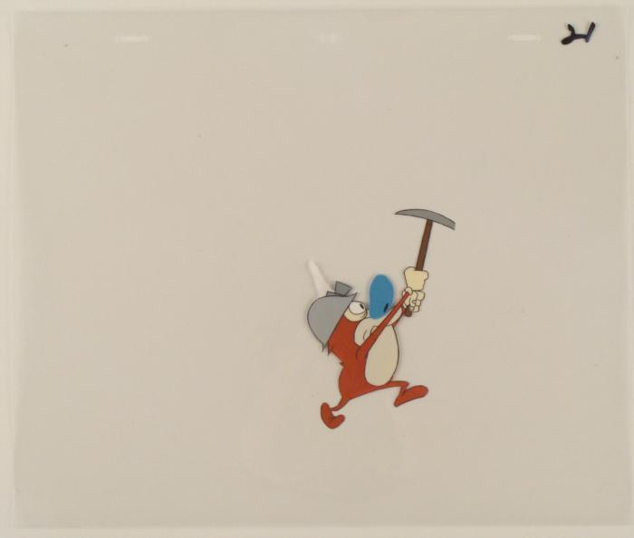 This is an original production animation cel from the Nickelodeon TV show Ren & Stimpy. The show follows two characters - Ren, a crazy Chihuahua - and - Stimpy, an incredibly stupid cat - as they think up to all kinds of hair brained schemes and get themselves into some sticky situations. The Ren and Stimpy Show debuted in August 1991 with a two-part episode, 'Stimpy's Big Day / The Big Shot' and became an instant hit. It was the third Nicktoon ever to be aired on the Network alongside Doug and Rugrats. Has Stimpy strike something big while he was mining?Original Production Art Cel Overall Size of the Cel: 10 1/2" x 12 1/2" Excellent condition This is an original hand-painted cel set-up used in the production of an episode of "The Ren & Stimpy Show." Each one-of-a-kind set-up represents a slight change in position of the characters. When individually photographed and projected in rapid succession, the images appear to move.