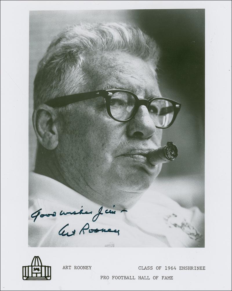 Glossy 8 x 10 Hall of Fame enshrinement photo, signed and inscribed in black felt tip “Good wishes Jim—Art Rooney.” In very fine condition.