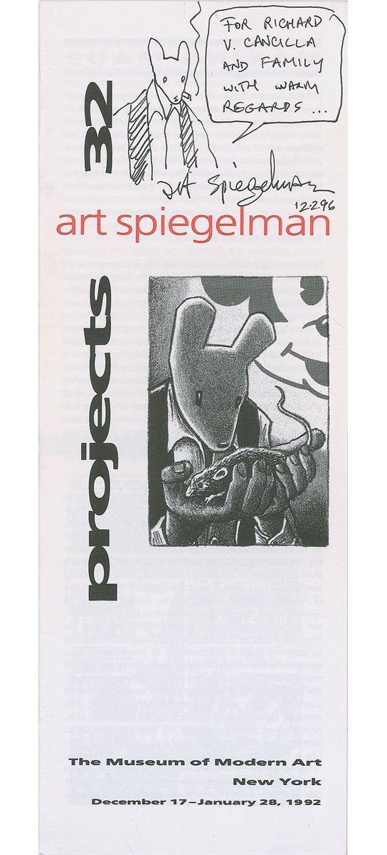 Brochure for Spiegelman’s Project 32 exhibit at the Museum of Modern Art in New York in early 1992, 4 x 11, signed and inscribed in black ink on the cover, “For Richard V. Cancilla and family, with warm regards…Art Spiegelman, 12.2.96,” adding a great sketch of Maus smoking a cigarette. In fine condition.