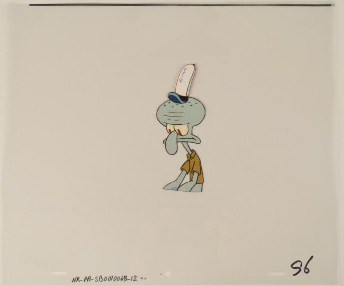 This original animation cel is from the Nickelodeon TV show SpongeBob Squarepants. The story takes place under the deep blue sea in Bikini Bottom, where SpongeBob resides. SpongeBob, who is a yellow, porous sponge, is your typical happy-go-lucky character, as he is always cheerful and enjoys making people laugh. Patrick Star, SpongeBob's neighbor who is a starfish, is your average children's show idiot, as he boasts knowing nothing and is often getting himself into ridiculous situations. Between the homes of these two lies the home of the miserable Squidward, a squid, who is known for being grouchy and playing tricks on SpongeBob and Patrick. Both SpongeBob and Squidward work at the Krusty Krab, a fast food business run by the greedy money-loving Mr. Krabs, a crab, the arch rival of the evil, possibly misunderstood, Plankton. Another neighbor, Sandy Cheeks, an athletic squirrel who normally wears an astronaut's space suit, was introduced in "Tea at the Treedome." She spends most of her time inventing and experimenting. Squidward dosen't seem too happy in this scene.Original Production Animated Cel Overall Size of Cel: 10 1/2" x 12 1/2" Very Good ConditionThis is an original hand-painted cel set-up used in the production of an episode of "SpongeBob SquarePants." Each one-of-a-kind set-up represents a slight change in position of the characters. When individually photographed and projected in rapid succession, the images appear to move.