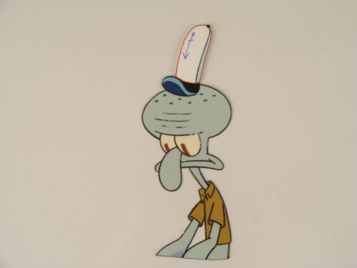 This original animation cel is from the Nickelodeon TV show SpongeBob Squarepants. The story takes place under the deep blue sea in Bikini Bottom, where SpongeBob resides. SpongeBob, who is a yellow, porous sponge, is your typical happy-go-lucky character, as he is always cheerful and enjoys making people laugh. Patrick Star, SpongeBob's neighbor who is a starfish, is your average children's show idiot, as he boasts knowing nothing and is often getting himself into ridiculous situations. Between the homes of these two lies the home of the miserable Squidward, a squid, who is known for being grouchy and playing tricks on SpongeBob and Patrick. Both SpongeBob and Squidward work at the Krusty Krab, a fast food business run by the greedy money-loving Mr. Krabs, a crab, the arch rival of the evil, possibly misunderstood, Plankton. Another neighbor, Sandy Cheeks, an athletic squirrel who normally wears an astronaut's space suit, was introduced in "Tea at the Treedome." She spends most of her time inventing and experimenting. Squidward dosen't seem too happy in this scene.Original Production Animated Cel Overall Size of Cel: 10 1/2" x 12 1/2" Very Good ConditionThis is an original hand-painted cel set-up used in the production of an episode of "SpongeBob SquarePants." Each one-of-a-kind set-up represents a slight change in position of the characters. When individually photographed and projected in rapid succession, the images appear to move.
