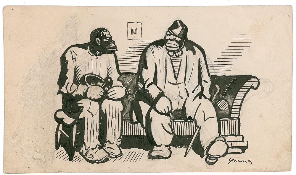 Cartoonist and writer (1866–1943) best-known for his socialist cartoons, especially those drawn for the left wing political magazine, The Masses between 1911 and 1917. Original signed ink sketch of two African American men seated on a sofa on an off-white 9 x 5.25 card., signed “Young” at the lower right corner. In fine condition with some light soiling.