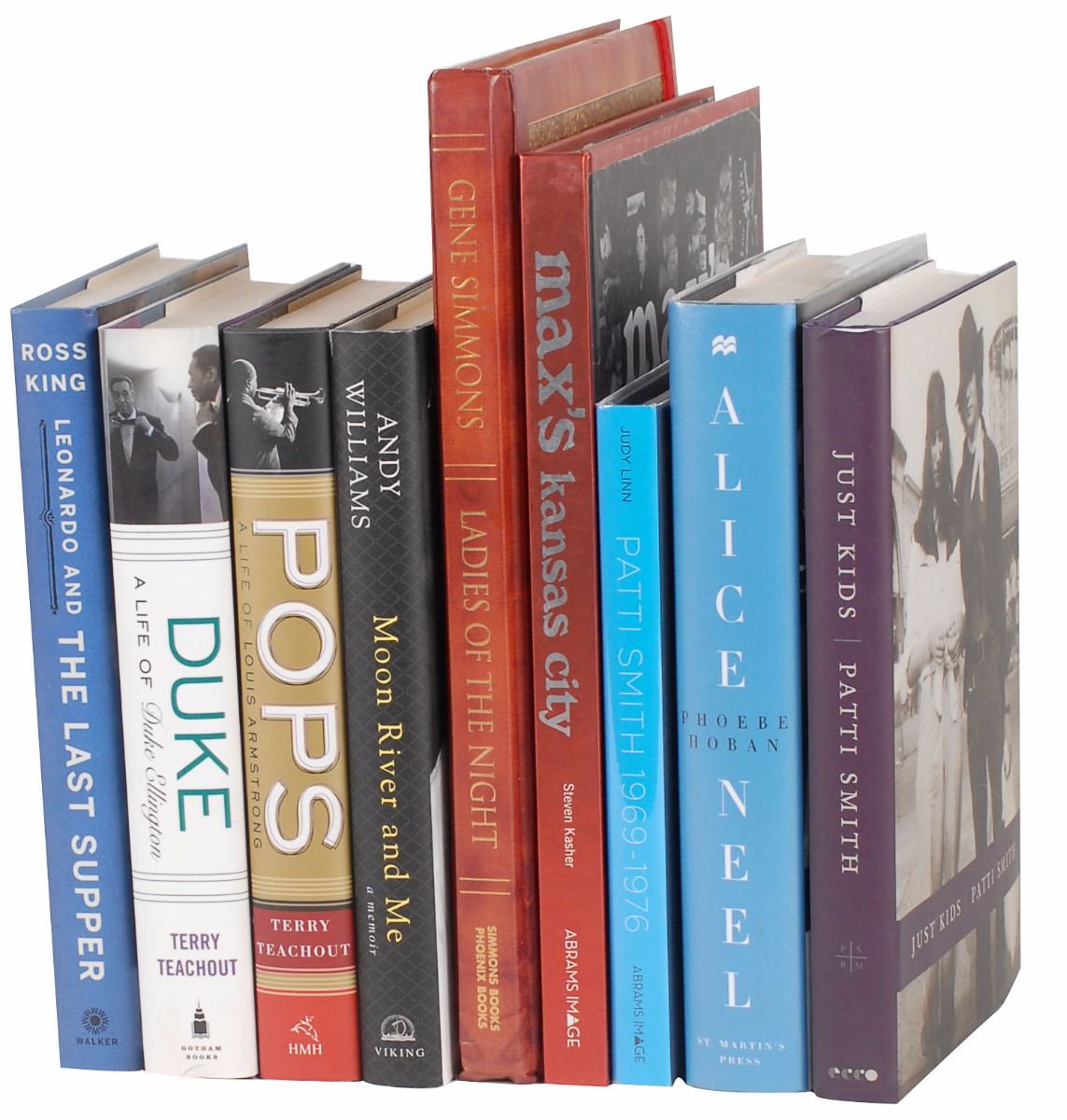 Complete list of authors and titles: Phoebe Hoban (Alice Neel: The Art of Not Sitting Pretty); Steve Kasher and others (Max’s Kansas City); Ross King (Leonardo and the Last Supper); Gene Simmons (Ladies of the Night); Patti Smith (Patti Smith: 1969-1976); Patti Smith (Just Kids); Terry Teachout (Duke); Terry Teachout (Pops); and Andy Williams (Moon River and Me).