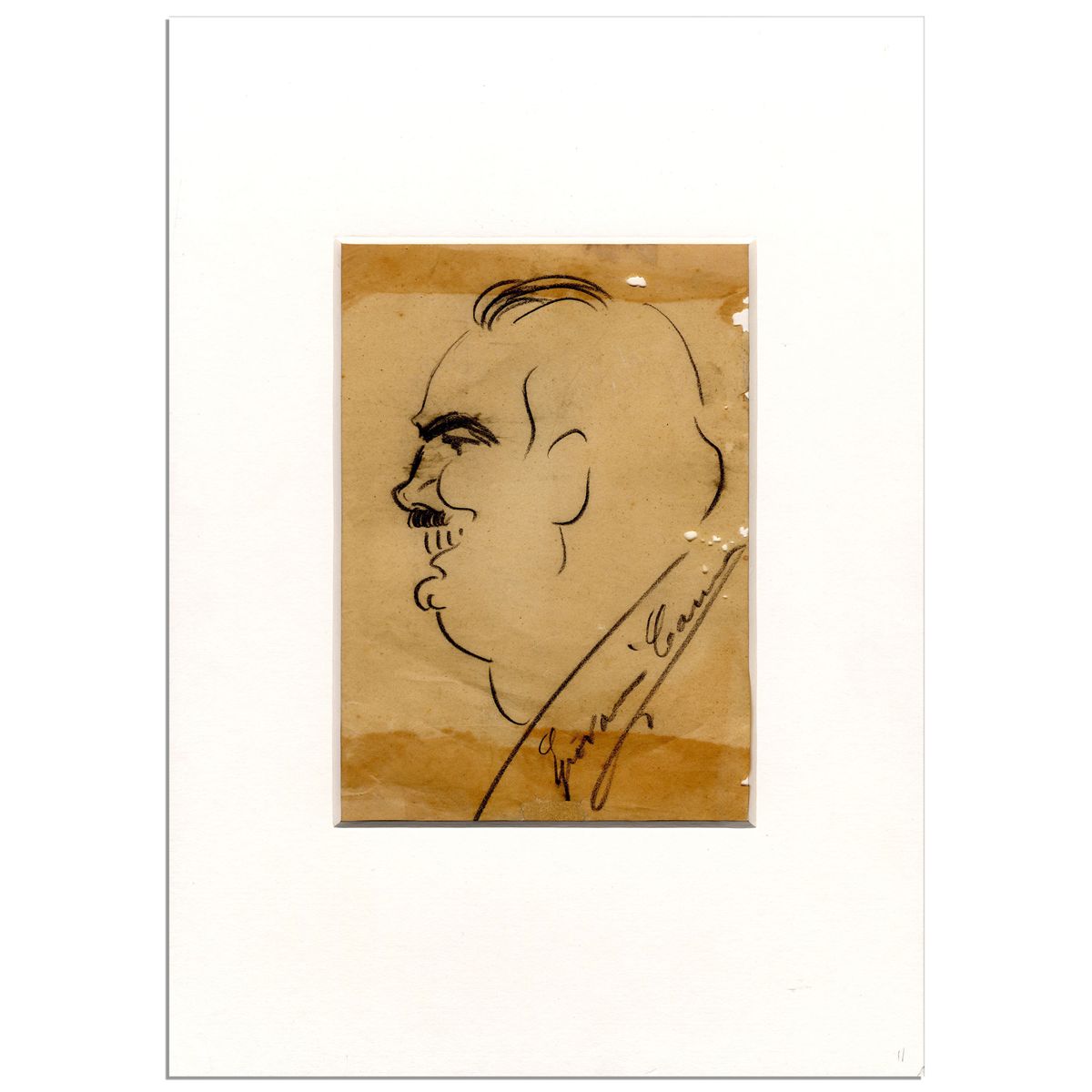 World-famous Italian opera singer Enrico Caruso hand-drawn self-portrait sketch signed. Charcoal sketch is likely of Caruso in character from one of his many performances. Best known for his signature role as Canio in ''Pagliacci,'' Caruso sang as a tenor at the New York Metropolitan Opera and counted Italian, German and French operas among his repertoire. Caruso's distinctive drawing style is evident in this sketch, which he signs, ''Enrico Caruso'' on the lower right. Matted in white to an overall size of 10.5'' x 14.5''. Toning and holes scattered on the right side, else near fine.