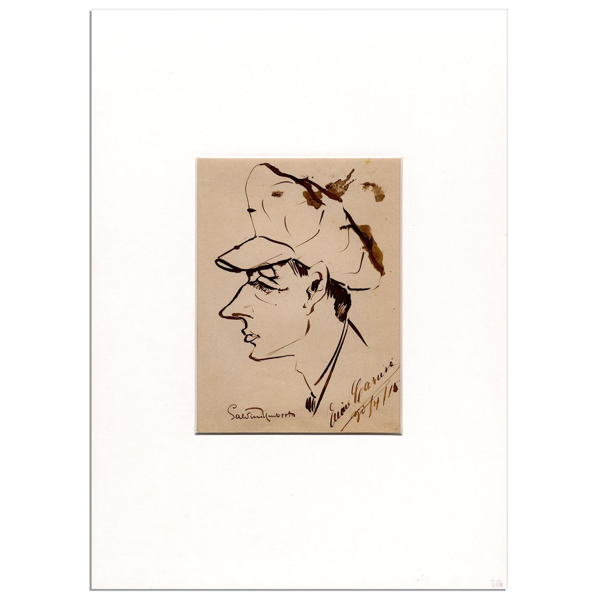 World-famous Italian opera singer Enrico Caruso hand-drawn sketch signed. Inked piece is likely one of Caruso's opera contemporaries in character, or possibly an acquaintance. Signed and dated ''Enrico Caruso / 20/4/15'' along with the name, ''Sal...Umberto''. Best known for his signature role as Canio in ''Pagliacci,'' Caruso sang as a tenor at the New York Metropolitan Opera and counted Italian, German and French operas among his repertoire. Caruso's distinctive drawing style is evident in this sketch, matted in white to an overall size of 10.5'' x 14.5''. Toning and blotting to subject's hat and a numerical pencil notation to lower right of mat, else near fine.