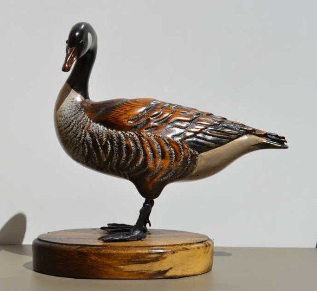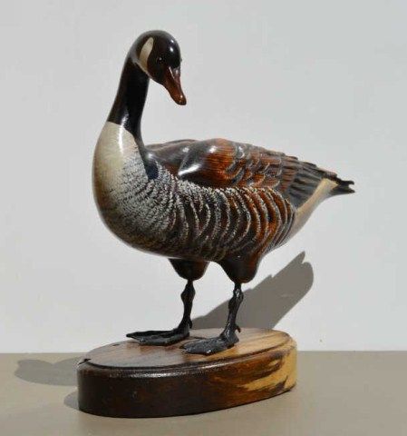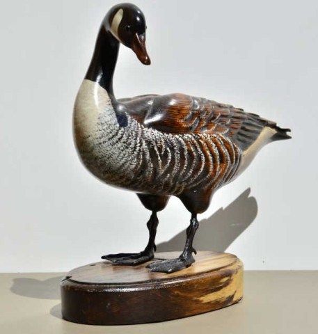Art carving of duck nicely painted with bronze feet, glass eyes, signed on base “Tom Tab” measures approx. 12”in height by 14” in width in fine condition. Est.; $150-$300