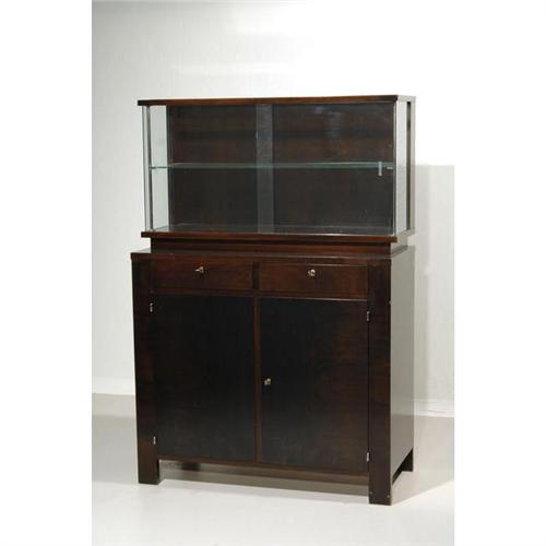 58h x 39w x 14d inches, brown refinished cherry wood, glass and chrome plated copper knobs, in original vintage good condition, attributed to LINGEL or KOZMA LAJOS Furniture Manufacturing Co., Budapest., coming with original locks and keys