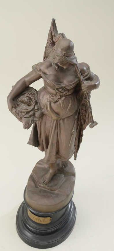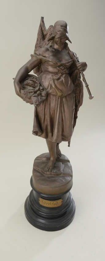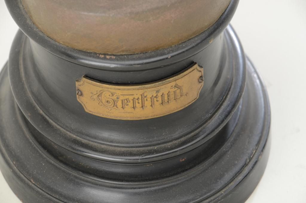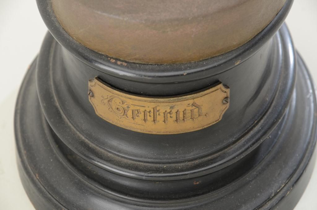 Art metal casting o lady entitled "Gertrud" on stone base. 26" in height. Germanic - 19th century style. Est: $300 - $600