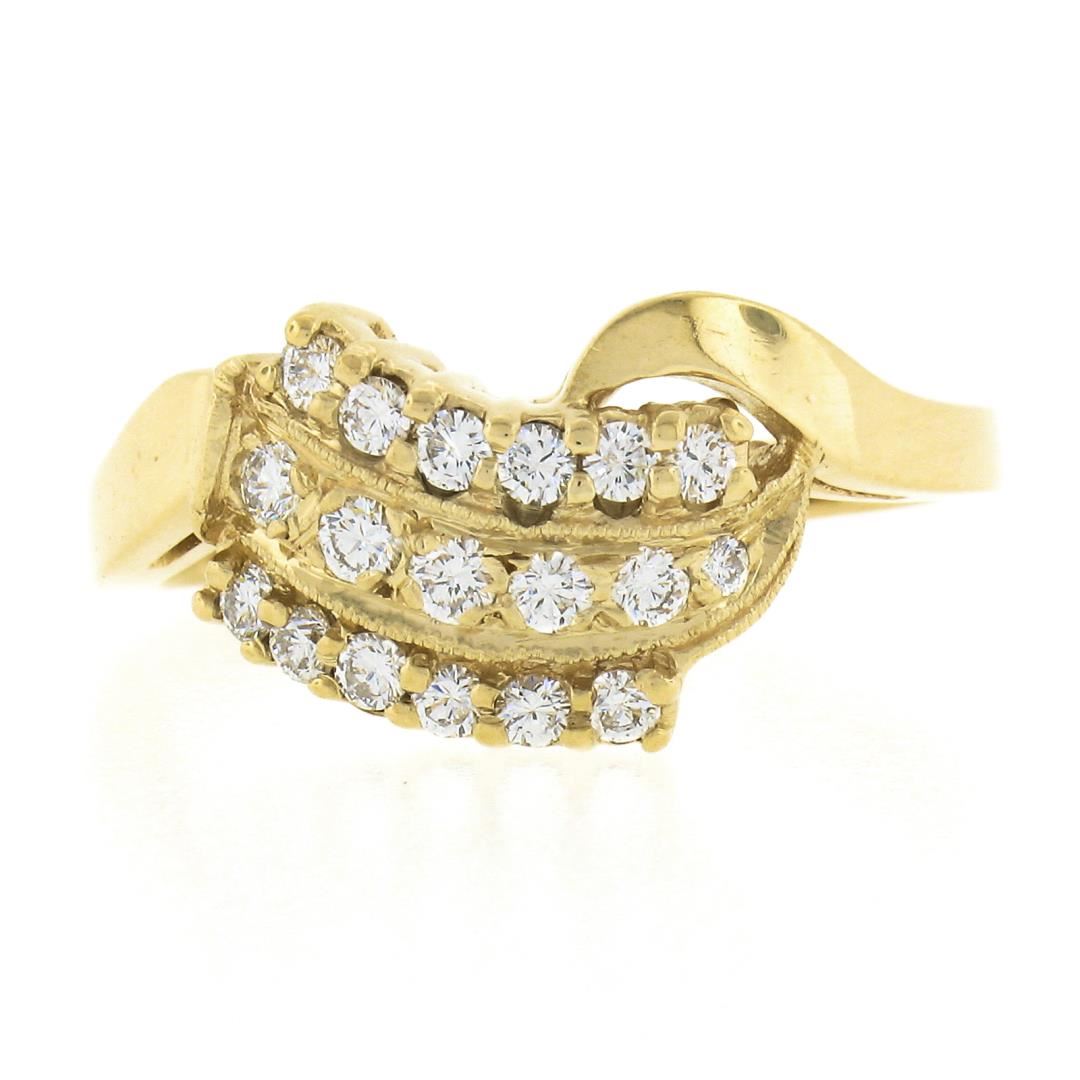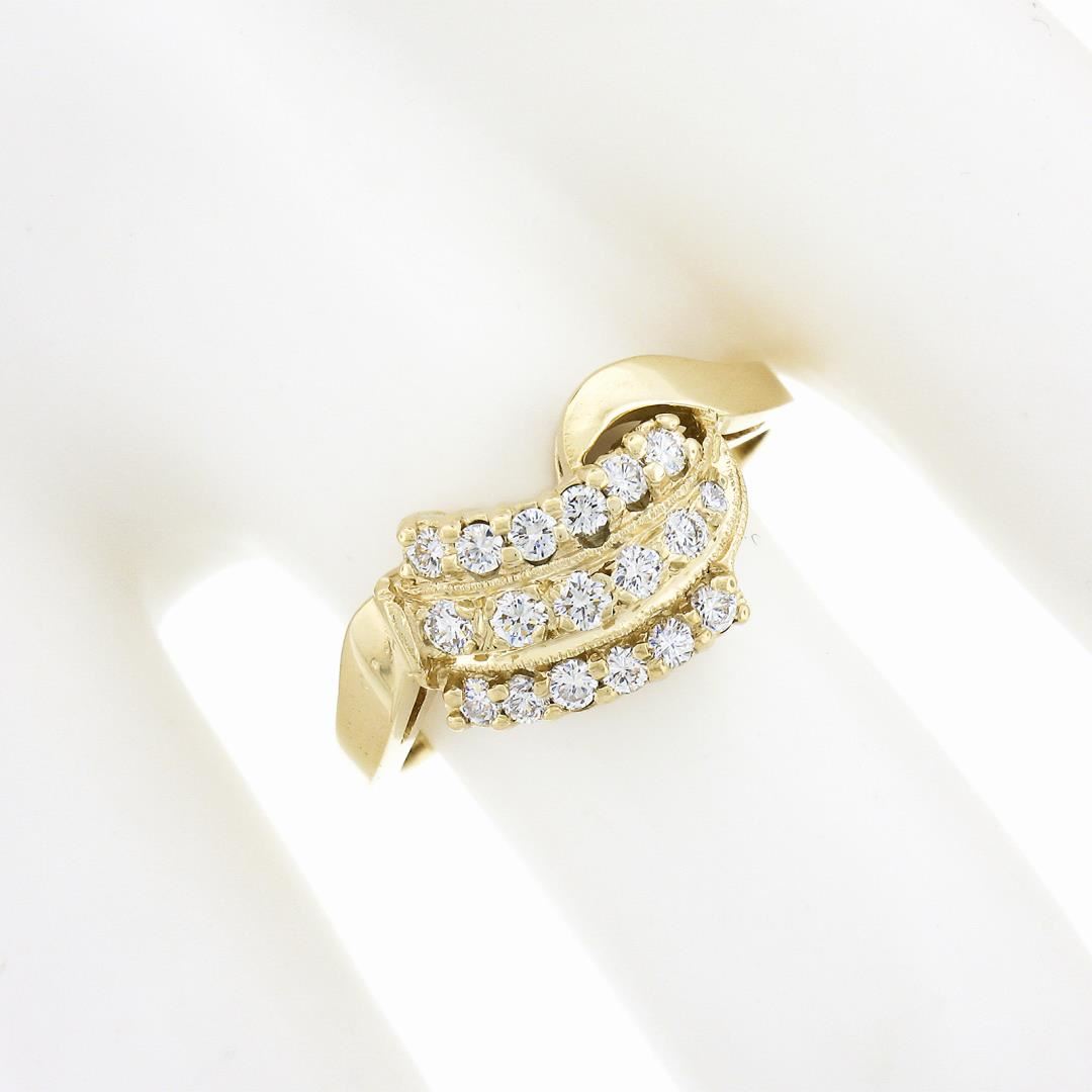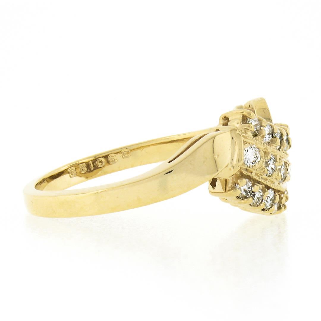 A solid 14k yellow gold 3 row ring, with 18 round brilliant cut natural diamonds (F/G - VS1/VS2 ; 0.45ctw). The ring is size 6.5, weighs a total of 4.05 grams, and measures 9.6mm wide.