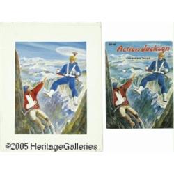 <B>Artcraft Staff Artist - Action Jackson Coloring Book Cover Original Art (Artcraft, 1973).</B></I> Action Jackson was one of the last gasps of the Mego line of action figures, after they had lost the license to the world's greatest superheroes (Batman, Superman, Spider-Man, Aquaman, etc.) with which they had made their name in the late '60s/early '70s. AJ was a minor hit for the company, even expanding into ancillary merchandise such as coloring books. Offered here is the vibrant cover art to a 1973 Action Jackson coloring book, as AJ rescues a stranded mountaineer with his strap-on helicopter pack. We have not been able to track down the artist behind this piece, but it is colorful and eye-catching, and would make a great addition to any Action Jackson collection. The artwork measures 12.25" x 16", with an image area of 8.75" x 11.5", which is almost exactly the size it was printed in the final book. The artwork is in Excellent condition, with some blunting at the corners and tape stains/damage across the top edge. Also included in this lot is a copy of the printed coloring book, very clean with no colored-in pages.