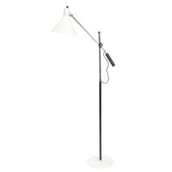 Arteluce floor lamp, Italy, c.1960, single adjustable white enameled metal shade on an adjustable chrome arm with leather-wrapped handle over a white marble base, 24”dia. x 68”h, good condition