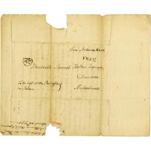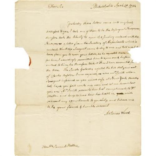 <B>Artemas Ward Autograph Letter Signed</B></I> “<I>Artemas Ward,</B></I>” one page, 8” x 9.75”. Philadelphia, April 30, 1794. Addressed by Ward on verso to “<I>Honorable Samuel Holton (sic) Esquire/Danverse/Massachusetts,</B></I>” noted by Ward “<I>To be left at the Post Office/in Salem,</B></I>” franked “<I>Free Artemas Ward.</B></I>” Small circular postmark “<I>30/AP,</B></I>” also stamped “<I>FREE.</B></I>” In part, “<I>Yesterday three letters came into my hands addressed to you, I took one of them to be the Insurgent Newspaper; therefore took the liberty to open it, & finding enclosed with the Newspaper a letter from the Secretary of Massachusetts which is enclosed. Winthrop Seargent came to day to me and told me had leave from you to open your letters, as he expected them for him, I accordingly permitted him to open one & he found enclosed to him, he therefore took it. Thus I have accounted for the three.</B></I><B><I>The Senate yesterday rejected the bill that grew out of Clarks Resolves.</B></I></B></I><I> I was rejoiced, as was Mrs. Smith when Seargent informed me you arrived safe at New York Thursday last…</B></I>” On April 23rd, from committee, Congressman Abraham Clark, a Signer of the Declaration of Independence, had presented a bill “to suspend the importation of certain goods, wares, and merchandise” on the House floor. On April 25th, the House passed the bill 58-34. Ward voted against passage; Holten wasn't present. The bill made it “unlawful to import into the United States any goods, wares, or merchandise, whatever, of the growth, produce, or manufacture, of Great Britain or Ireland” because of “violations committed by Great Britain, on their neutral rights and commercial interests, as well as from her failure to execute the seventh article of the treaty of peace…” The Senate vote was 13-13. Vice President Adams voted “no” to break the tie and the Senate advised the House that it did not concur in this bill. Samuel Holten, a Signer of the Articles of Confederation, was a member of the U.S. House of Representatives (1793-1795) when he received this letter from Artemas Ward. He had previously been a member of the Continental Congress (1778-1780, 1783-1785, 1787) and had served as its President pro tempore in 1785. Artemas Ward was a colleague of Holten's in the House, serving from 1791-1795. In the Revolutionary War, in 1775, Ward was appointed by the Continental Congress as Major General, second in command to General Washington. Portions missing at right margin and blank left margin from opening of letter. Seal tear at right margin affects three words. Otherwise, in fine condition.<BR><BR><b>Shipping:</b> Flat Material, Small (<a target="_blank" href="http://www.heritageauctions.com/common/shipping.php">view shipping information</a>)