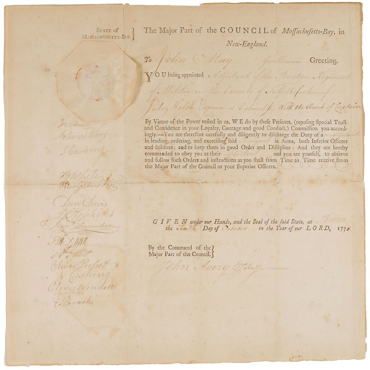 Major general in the Revolutionary War (1727–1800), second in command to George Washington, and, later, congressman from Massachusetts. Partly-printed Revolutionary War-dated DS, one page, 13 x 13, October 10, 1778. The Massachusetts-Bay Council appoints John May an “Adjutant of the Boston Regiment of Militia in the County of Suffolk whereof Jabez Hatch Esquire is Colonel with the rank of Captain.” Signed along the left border by 15 members of the council: Artemus Ward, Jeremiah Powell, Thomas Cushing, Benjamin White, Benjamin Austin, Daniel Davis, Daniel Hopkins, Timothy Danielson, Francis W. Dana, Abraham Fuller, Oliver Prescott, Nathan Cushing, Oliver Wendell, Samuel Niles, and Eleazar Brooks. In very good condition, with intersecting folds (reinforced on the reverse), a few small areas of paper loss along folds and edges, and scattered toning. The paper seal is lightly toned and intact. A great connection between 15 influential Massachusetts leaders and an early revolutionary.