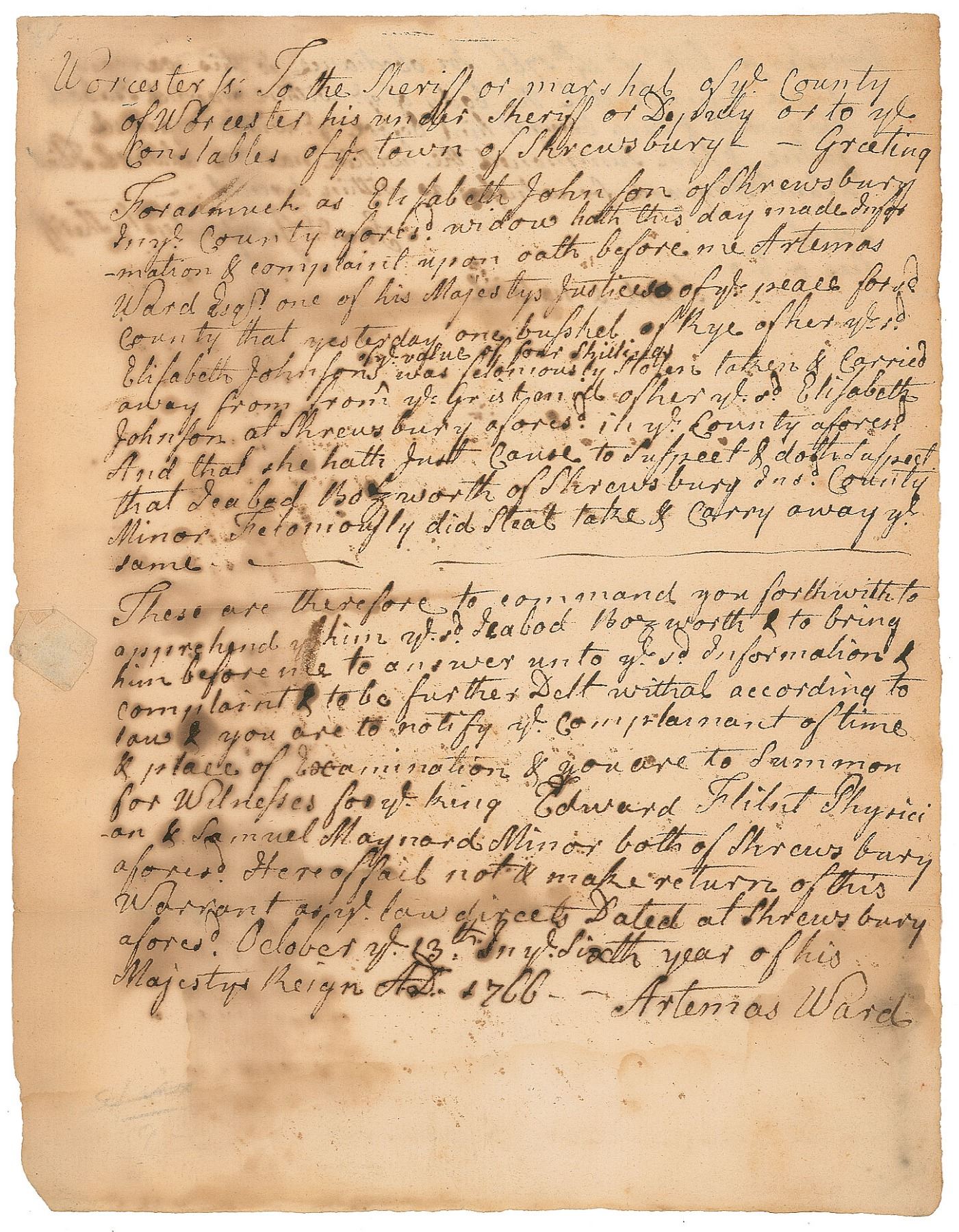 Major general in the Revolutionary War (1727–1800) who was second in command to George Washington, and, later, congressman from Massachusetts. Scarce ADS, one page, 6.5 x 8.5, January 13, 1766. Handwritten legal document by Ward as a justice of the peace, in part: "To the Sheriff or marshal of ye County of Worcester…or to ye Constables of ye town of Shrewsbury—Greeting. For as much as Elizabeth Johnson of Shrewsbury…hath this day made Information & complaint upon oath before me Artemas Ward Esq'e one of his Majesty's Justices of the peace for sd county that yesterday one bushel of Rye…was feloniously stolen taken & carried away…And that she has just cause to suspect & doth suspect that Icabod Bozworth of Shrewsbury…did steal take & carry away ye same. These are therefore to command you forthwith to apprehend him ye sd Icabod Bozworth & to bring him before me to answer unto ye sd Information & complaint." On the reverse is a note by a deputy sheriff, stating that Bozworth was apprehended, and the case was settled without trial. In very good condition, with overall staining, not affecting readability. During this period, Ward was a vocal opponent against Parliament's increasing oppression of the New England colonies, which soon cost him his military commission. With rebellious sentiment growing in the next decade, the 3rd Regiment resigned en masse from British service on October 3, 1774, marched to Shrewsbury, and informed Ward that they had elected him as their leader. A fantastic, rare autograph from one of the most significant figures of the Revolution.
