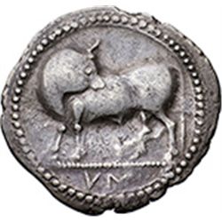 Greece. Macedonia, Akanthos. Tetradrachm, circa 480-470 BC. Obv. Lion right, head in profile, biting into the hindquarter of a bull standing left, p