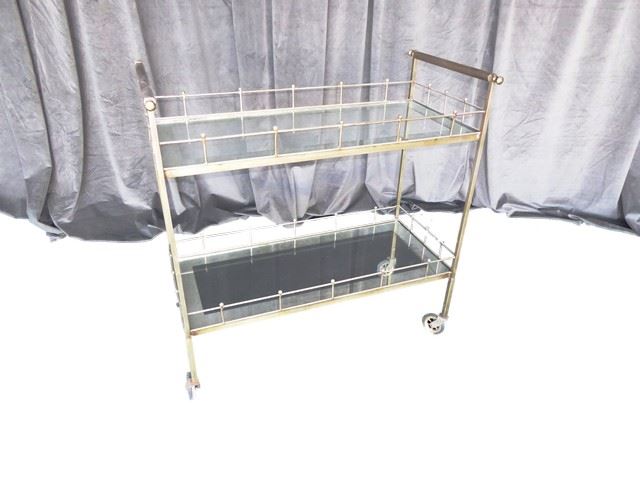 BC09 - 'Arteriors' Antique Gold Rectangle Bar Cart w/glass shelfs + wheels Dims: 32.5"W x 14"D x 33.5"H Condition: lightly used/small scratches/wheels don't easily roll *sold as set of 2