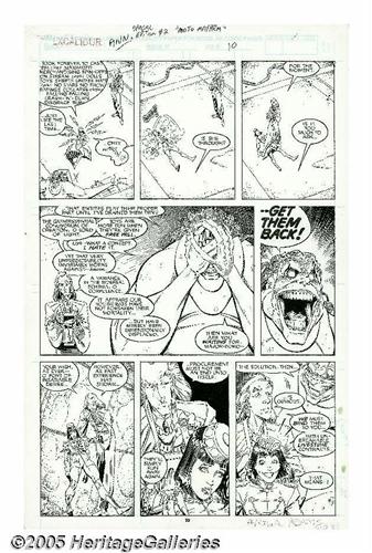 <B>Arthur Adams and Terry Austin - Excalibur Mojo Mayhem, page 10 Original Art (Marvel, 1989).</B></I> Deep within the Mojoverse, minions Major and Minor Domo mollycoddle their master, megalomaniacal Mojo, the master of his own Mojoverse. Major Domo informs him of the possibility of binding his subjects with unbreakable "livestime" contracts, a concept that seems to placate his master for the moment. From the Chris Claremont script, "Mojo Mayhem," this page has an image area measuring 10" x 15" and the art is in Excellent condition.