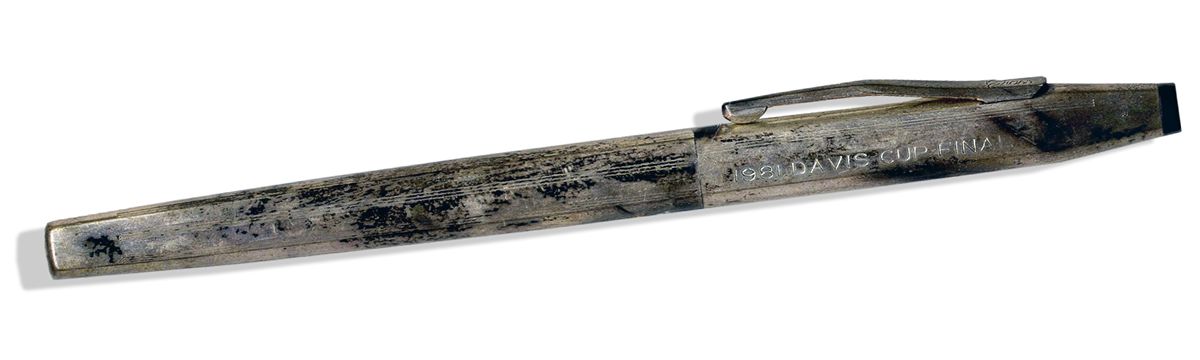 Arthur Ashe's personally owned Davis Cup pen, engraved ''1981 Davis Cup Final'' across pen cap. The Davis Cup serves as the premiere mens' international competition, run by the International Tennis Federation (ITF). Ashe captained the U.S. Davis Cup team in 1981, the year designated on this pen. Bronze pen has heavy tarnishing throughout. Pen measures 5'' across. Ink missing, though can be refilled. Very good condition. With an LOA from Ashe's widow.